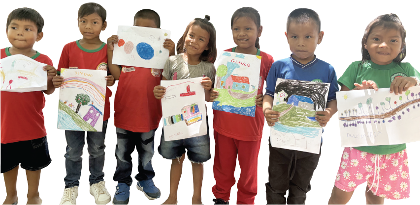 Crianças Baniwa apresentam seus desenhos.