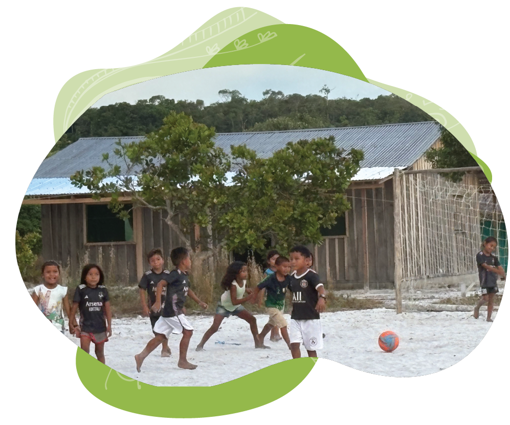 A relação que se estabelece entre adultas(os) e crianças é de respeito e de confiança. As(Os) professoras(es) acompanham as crianças ao longo do dia, nos horários de aula e também fora desse horário. São elas que organizam os times e as partidas de futebol, vão com as crianças no igarapé para o banho, ajudam na hora da alimentação. As crianças são livres e aprendem brincando, se relacionando com a natureza, acompanhando e observando as(os) adultas(os) em seus afazeres diários.